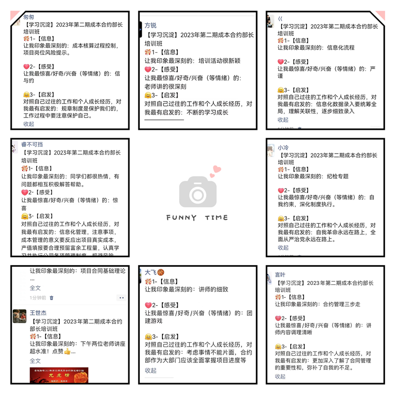 本次培訓班課程由公司內部培訓師講授,課程設置方面注重以立足公司生產(chǎn)實際的真實案例進行分析,旨在強化項目成本合約部長必備的專業(yè)技能和職業(yè)素養(yǎng),具體包括項目成本策劃、合約部信息化操作、項目合同管理法律風險防范、合約部基礎管理、二次經(jīng)營、紀檢專題培訓、情緒與壓力管理等內容。