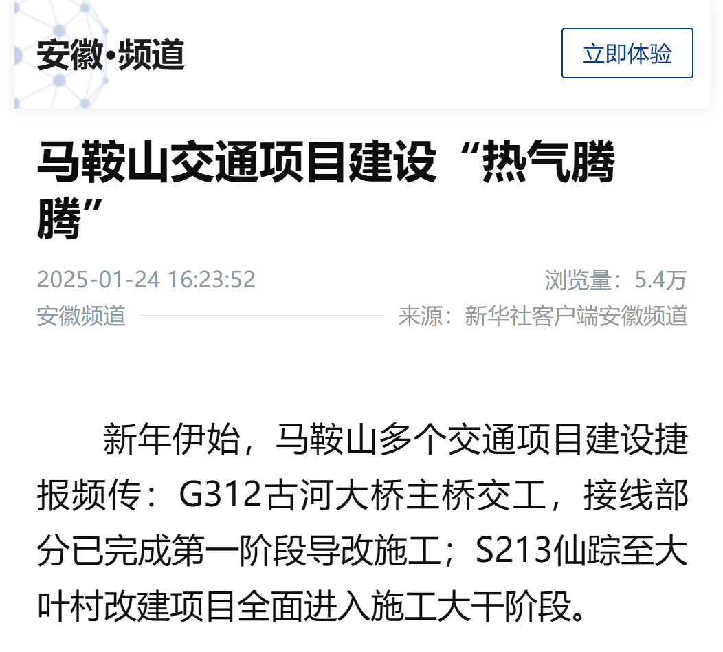 新年伊始,馬鞍山多個交通項目建設捷報頻傳:G312古河大橋主橋交工,接線部分已完成第一階段導改施工;S213仙蹤至大葉村改建項目全面進入施工大干階段。