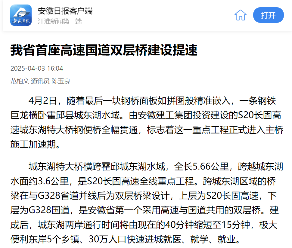 4月2日,隨著最后一塊鋼橋面板精準(zhǔn)嵌入,由安徽建工集團投資建設(shè)的S20長固高速路基01標(biāo)段迎來重大節(jié)點——城東湖特大橋鋼便橋?qū)崿F(xiàn)全幅貫通,為主橋施工打通了"任督二脈"。