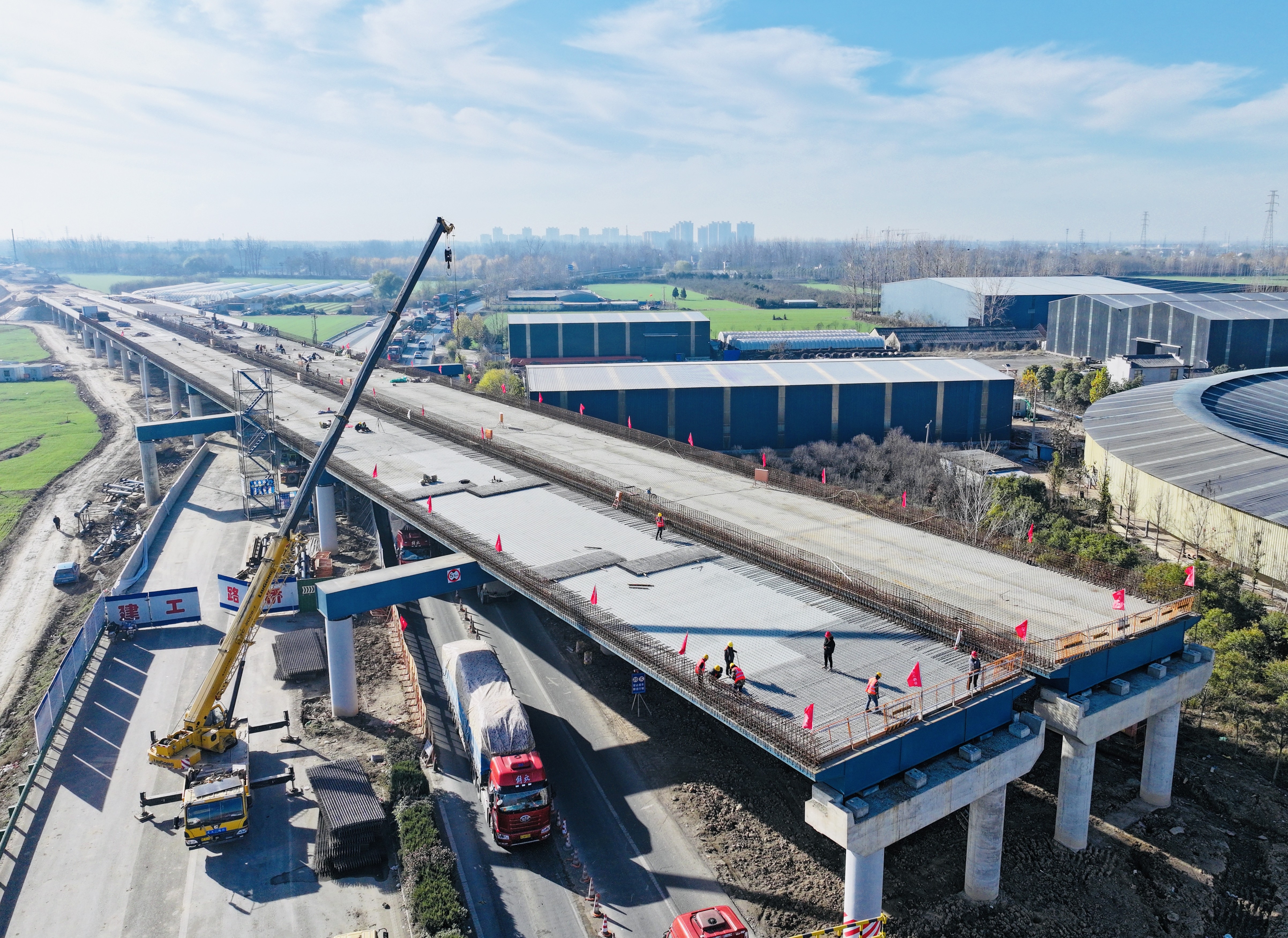 在另一處重點控制性工程劉橋互通,其采用A型單喇叭方案設計,范圍內共有6座橋梁,跨徑組合涵蓋預制箱梁、支架現澆及鋼箱梁。面對下部結構復雜,施工要求高等挑戰,項目全力統籌資源,通過勞動競賽“以競促效、以賽保值”,不斷強化生產組織與技術質量,高峰期240余名參建人員日夜鏖戰,40臺各類機械設備開足馬力同步作業。2024年1月3日,現澆箱梁施工提前完成,4月16日,主線橋鋼箱梁架設提前4個月收官,再次刷新了“建工速度”。