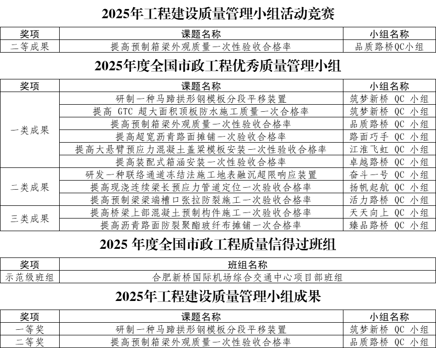 近日,中國市政工程協會、中國建筑業協會、中國施工企業管理協會先后公布2025年度質量管理小組及班組活動成果大賽評選結果,公司共斬獲15項國家級獎項。