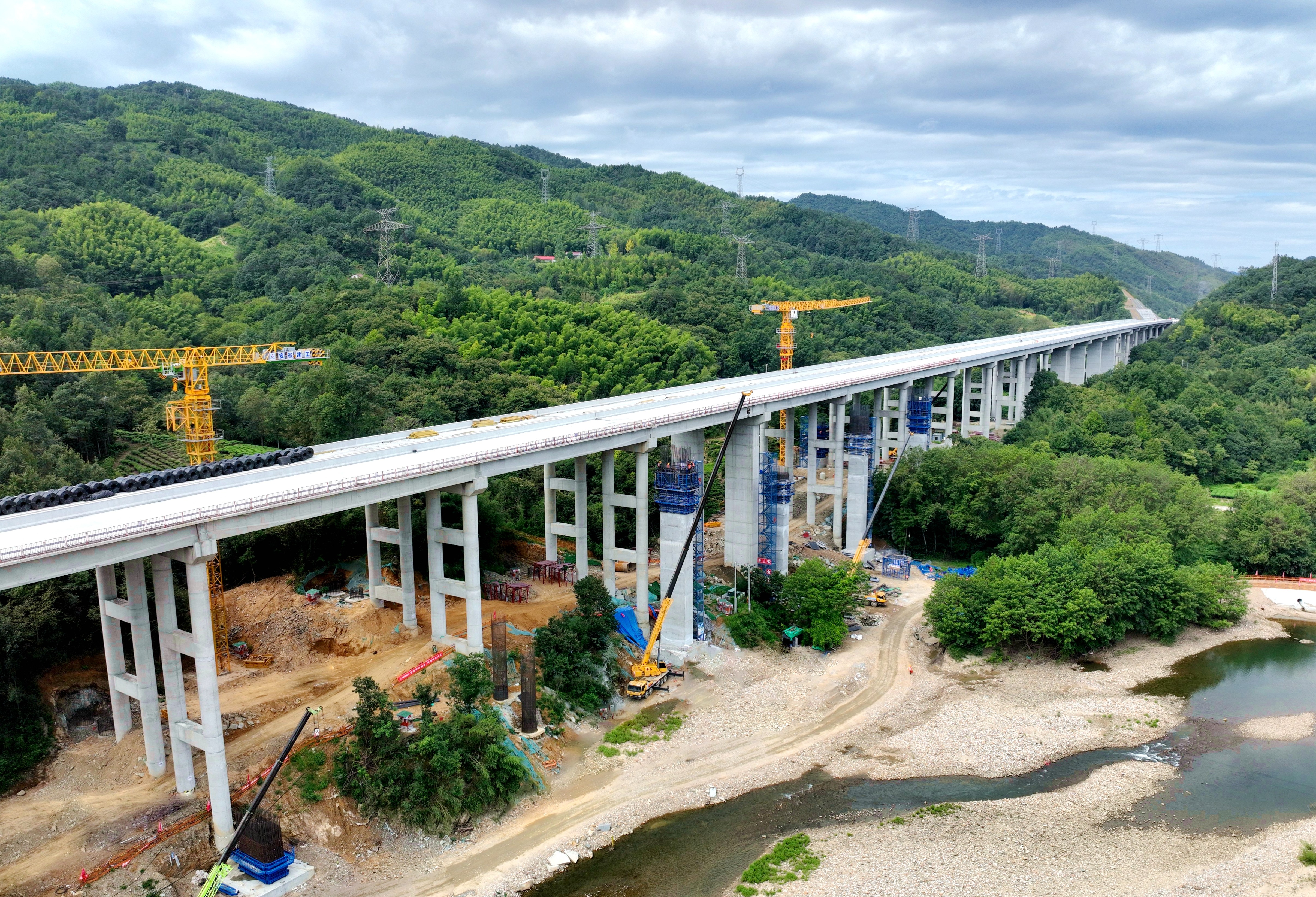 青山樞紐是項(xiàng)目起點(diǎn),與在建的和襄高速(六安段)連接,肩負(fù)著兩條高速“牽手”的使命。新建樞紐由5座匝道橋和1座拼寬橋組成,均為高墩柱、大跨徑橋梁,其中A、C兩條匝道需要對和襄高速十里溪大橋拼寬施工。項(xiàng)目技術(shù)負(fù)責(zé)人孫維龍告訴記者,“和襄高速預(yù)計(jì)2025年底實(shí)現(xiàn)全線通車,該樞紐也要在年底前完成橋梁主體結(jié)構(gòu)施工”。