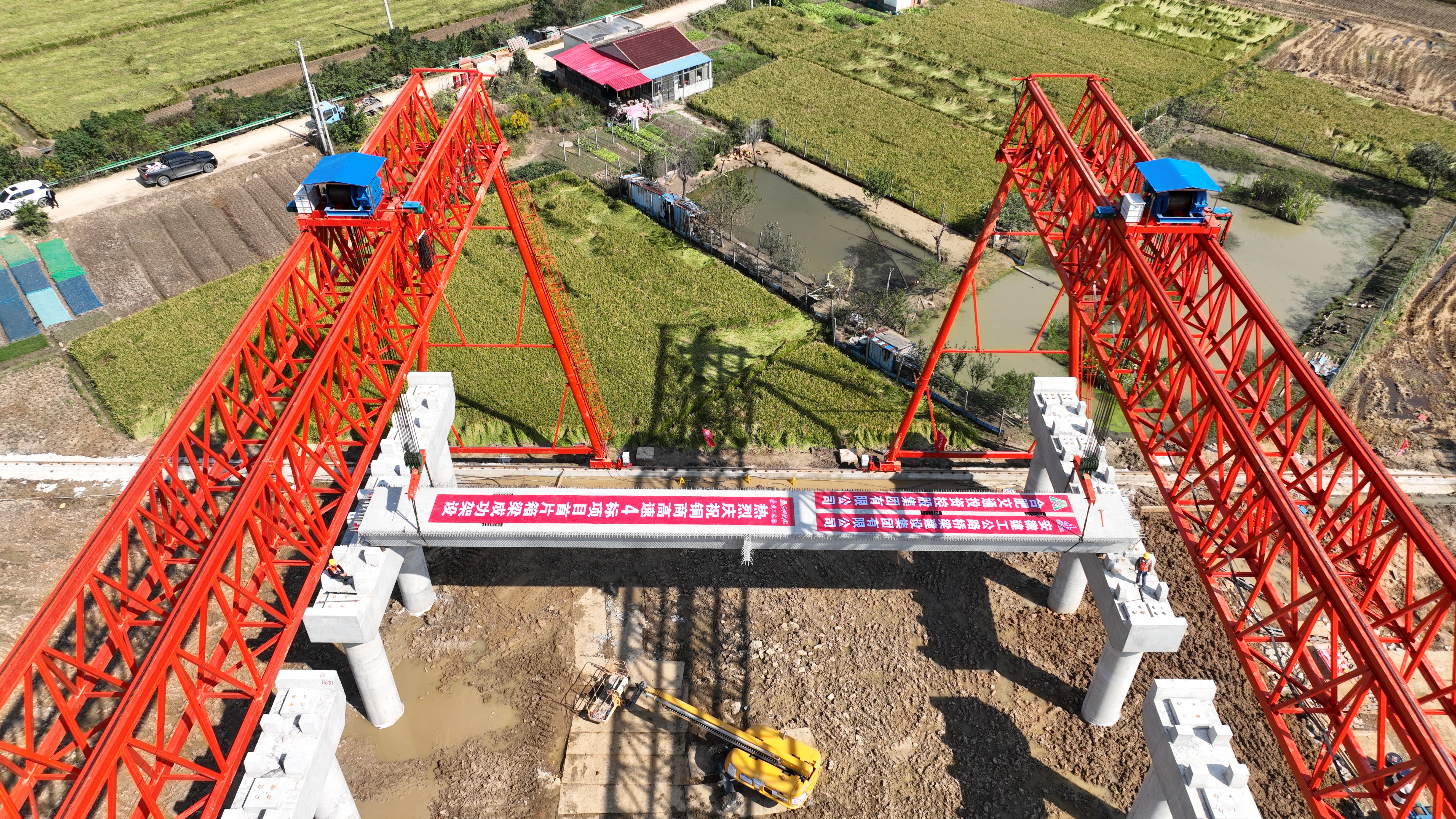 本次作業(yè)箱梁長30米,重達(dá)99.32噸。為確保預(yù)制箱梁順利架設(shè),項(xiàng)目部在正式起吊前進(jìn)行了嚴(yán)格的試吊檢驗(yàn),有效把控箱梁施工質(zhì)量。同時,對設(shè)備與吊具安全性進(jìn)行了全面排查,并不斷優(yōu)化運(yùn)架梁方案,全力保障了施工過程中的質(zhì)量穩(wěn)定與作業(yè)安全。此外,項(xiàng)目在杭埠河南北兩岸同步增置了2個提梁點(diǎn),形成“南北兩岸同步發(fā)力、雙點(diǎn)作業(yè)”的架設(shè)格局,有效提升了施工效率。