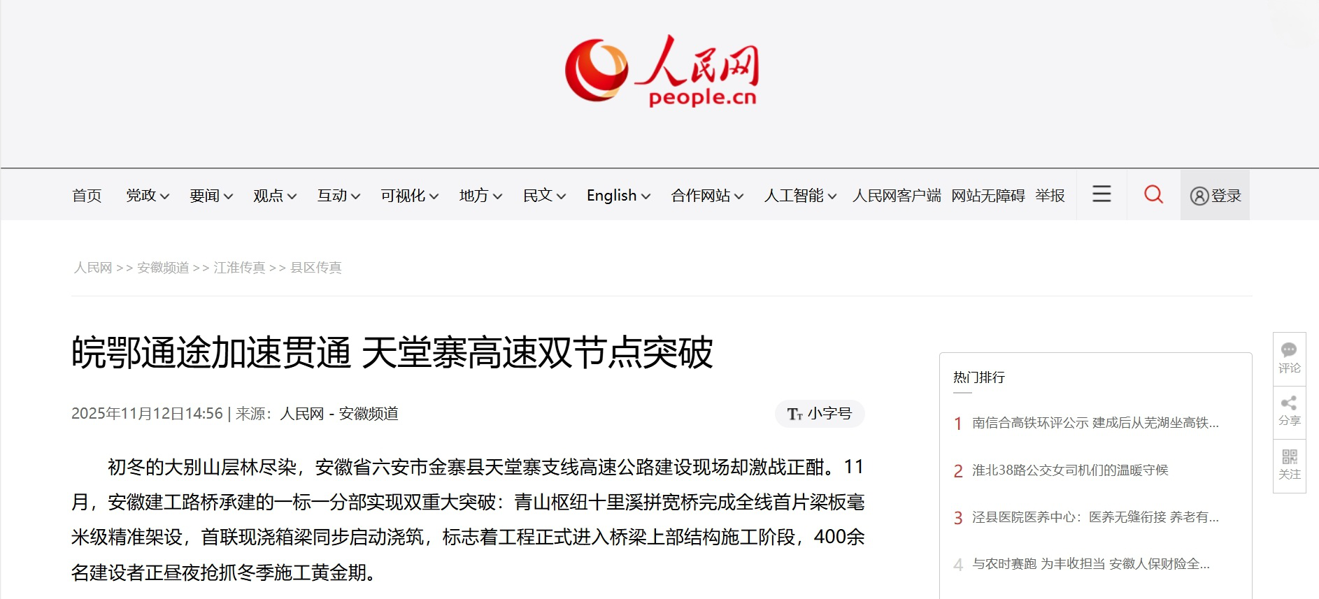 【名媒聚焦】人民網安徽頻道:皖鄂通途加速貫通 天堂寨高速雙節點突破