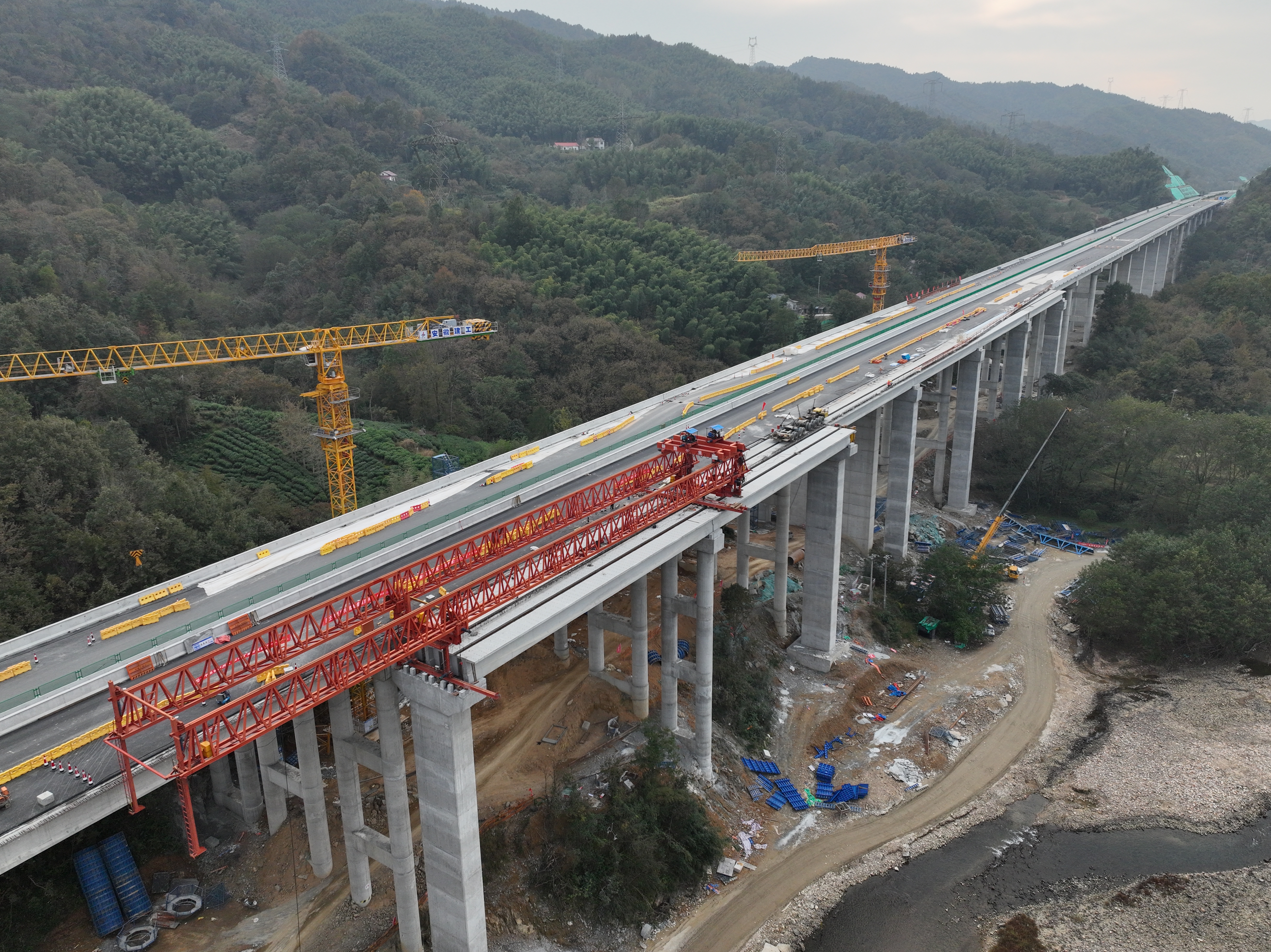 初冬的大別山層林盡染,安徽省六安市金寨縣天堂寨支線高速公路建設現場卻激戰正酣。11月,安徽建工路橋承建的一標一分部實現雙重大突破:青山樞紐十里溪拼寬橋完成全線首片梁板毫米級精準架設,首聯現澆箱梁同步啟動澆筑,標志著工程正式進入橋梁上部結構施工階段,400余名建設者正晝夜搶抓冬季施工黃金期。