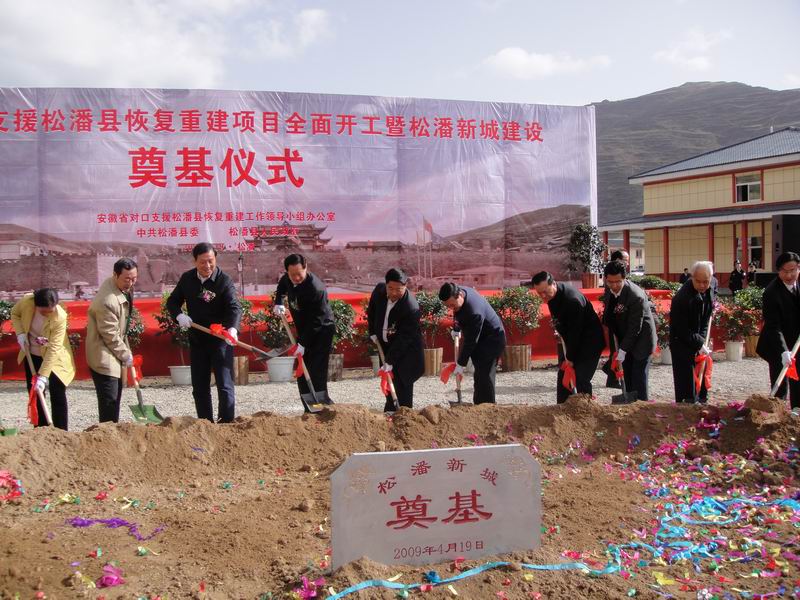 安徽省駐松援建辦主任孔曉宏首先介紹了開工項目情況,松潘縣委書記、縣人大常委會主任黃芝林致辭發言,施工單位、監理單位代表分別作了發言。阿壩州州長吳澤剛、安徽省省長助理、省對口援建辦主任梁衛國也先后作了重要講話。最后,安徽省人大副主任朱先發宣布安徽省對口援建松潘縣恢復重建項目全面開工,安徽省、四川省、阿壩州、松潘縣領導在隆隆的禮炮聲中為松潘新城建設開挖了第一鍬土。