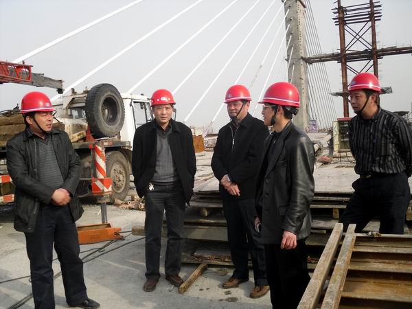 在大橋主跨施工現場,項目經理江仲明向戴總一行詳細匯報了工程質量、進度、安全控制情況。戴總對我部當前的工程進展情況表示滿意,希望我部再接再厲,特別是在工程收尾階段不能松懈,要一如既往的做好各項工作,繼續加強文明施工,扎實推進項目精細化管理。