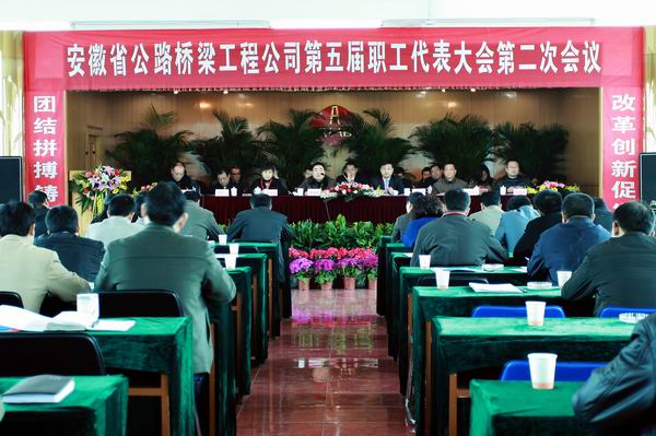 上午8:30,在莊嚴的國歌聲中,第五屆職工代表大會第二次會議正式開幕。會議由公司黨委委員、副總經理、總工程師彭申凱主持。公司總經理汪衛東在會上作了題為《夯實管理基礎,拓展發展空間,為推動安徽路橋快速發展而努力奮進》的工作報告。報告回顧總結了2009年工作。2009年是新世紀以來我國經濟發展最為困難的一年。公司面對復雜快變的市場環境,在集團公司的科學指導下,主動適應市場,搶抓機遇,呈現了平穩較快發展的良好局面,譜寫了實現新崛起的動人篇章。公司先后榮獲安徽省建筑業企業五十強、合肥市委市政府文明單位等市廳級以上集體榮譽11項,形象大幅提升。全年新簽合同額14.7億元,同比增長20%,經營業績再創新高。完成總產值約11.08億元,同比增長10.8%,施工產值再上新臺階。主營業務收入8.34億元,實現利潤總額530.3萬元,同比增長35.22%,資產保值增長率106.5%,經濟效益穩步增長。創“黃山杯”、“建工杯”各1項,各類科技進步獎(工法)8項,創建安全文明示范工地5個,連續三年無重大安全和質量事故。