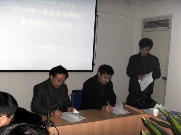 最后,副總經理、總工程師彭申凱和總經理汪衛東分別對2010年安全生產管理工作做了部署和要求。彭總強調各項目部要抓好日常檢查工作,整改要有記錄;要提高全員安全意識;危險性較大的分部分項工程,項目部要制定安全專項施工方案,并要通過公司審批;項目部要有切實可行的應急救援預案,要定期演練。汪總對去年的安全生產工作進行了回顧,肯定了去年的安全生產工作取得的成績,同時指出公司生產規模在不斷擴張的同時,安全生產形勢不容樂觀,他強調:一、各項目部要狠抓責任制落實,特別是提高工程技術人員的安全責任意識,真正使“安全生產人人有責”落到實處;二、切實增強管理人員的“人本”意識,同時增加安全經費的投入,使各項安全措施扎實有效;三、加大安全檢查及隱患整改力度,鼓勵一線員工參與現場的安全管理工作,對發現的安全隱患及時報告,并適當給予獎勵。