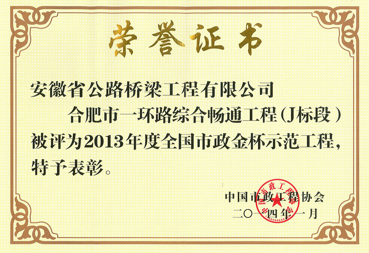 合肥市一環(huán)路暢通工程J標(biāo)-全國市政金杯示范工程獎(jiǎng)